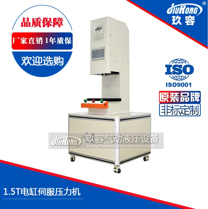 1.5噸伺服壓力機是半弓型結構的伺服電缸驅動型壓力機,產品型號為:JRX-100S-150L-1.5T-11KW, 動作產品是1.5噸電缸,150mm總行程,移動速度100mm/s。通過電氣化控制,可以任意編程滑塊的行程、速度、壓力等,甚至在低速動轉時也可達到伺服壓力機的公稱噸位。